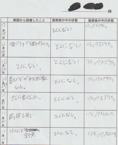 これからご覧になって頂く用紙は、いわゆる「皆様の声」ではありません。この用紙は来所された方の全員に、初日から来所の度に書いて頂く「症状の記録用紙」です。なおこの用紙の掲載にあたっては、事前にご本人の了解を得ております。勝手に載せる事は一切しませんので、ご安心下さい。